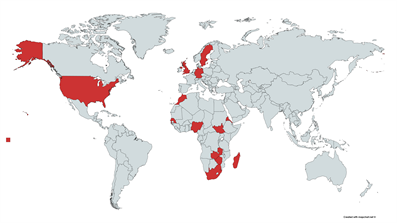 Eritrea (Au, VMS); South Sudan (Au); Madagascar (Au, PGE, Ni-Cu); Nigeria (Au), Senegal (Au); South Africa (Au, Coal), Zambia (Iron ore, Cu); Zimbabwe (Au, coal)